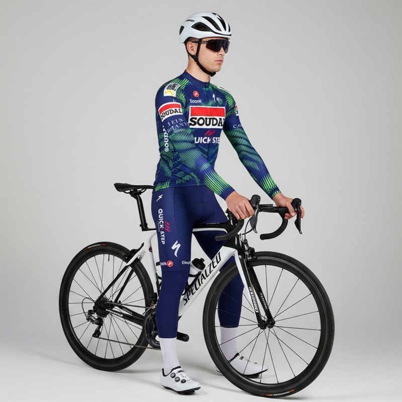 Cette tenue cycliste hiver équipe pro SOUDAL QUICK-STEP 2026 à prix exceptionnel comprend 1 cuissard vélo + 1 maillot cyclisme à manches longues.